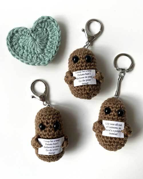 The pattern is called the Positive Potato from Leanna's Designs. Thanks, Leanna, for the free pattern! I used up little bits of Knit Picks Swish Worsted in Doe color. I've got some leftovers in Squirrel Heather that I will be using up soon to make more!